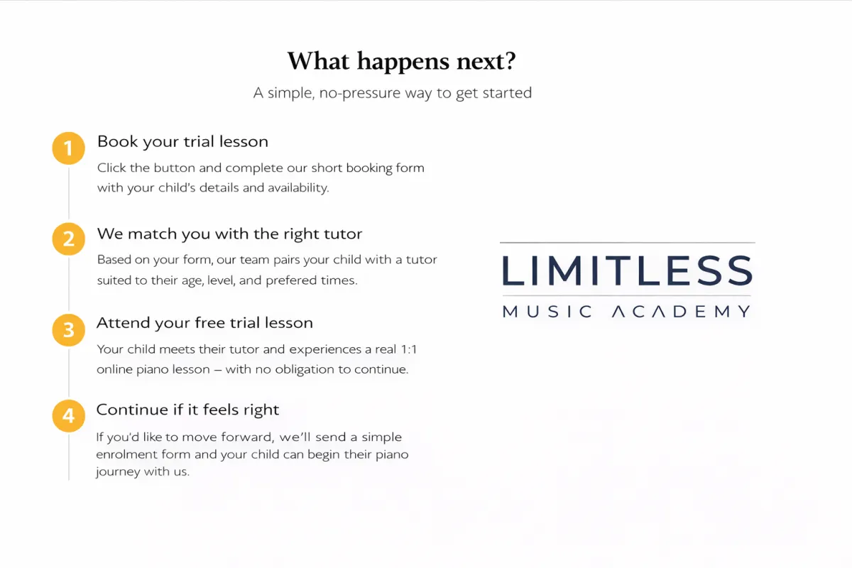 If you’d like to move forward, we’ll send a simple enrolment form and your child can begin their piano lesson journey with us.